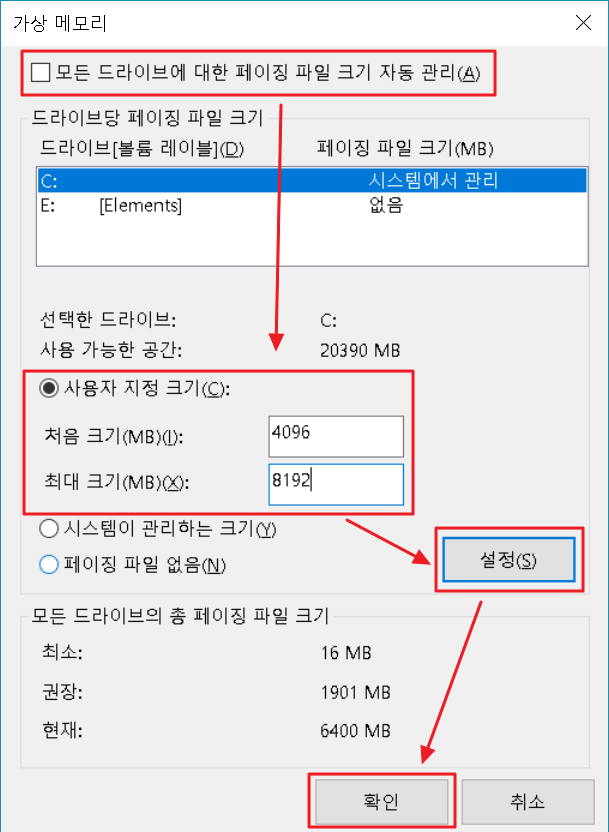 사용자 지정 크기 선택 후 여러분의 램(메모리) 용량에 맞게 처음 크기, 최대 크기를 입력하신 후 설정 버튼 클릭, 확인 버튼을 클릭하면 완료됩니다.
