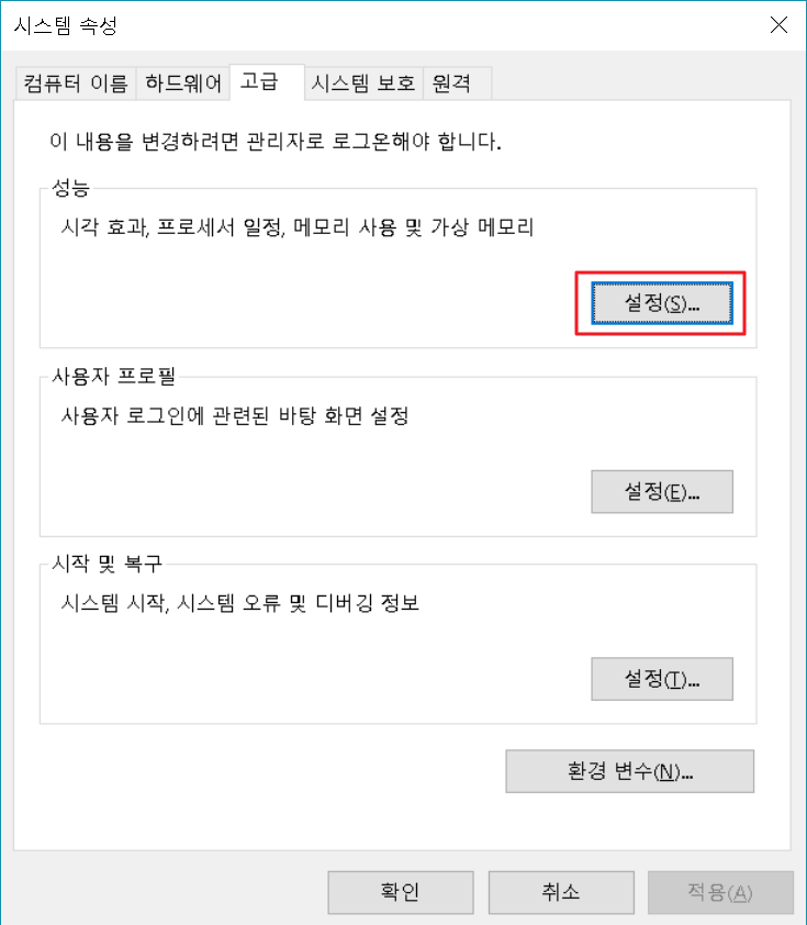 시스템 속성 - 고급 탭 내 성능에서 설정을 클릭합니다.