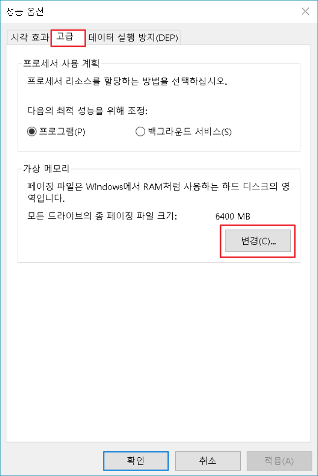 성능 옵션 - 고급 탭에서 가상 메모리 - 변경을 클릭합니다.